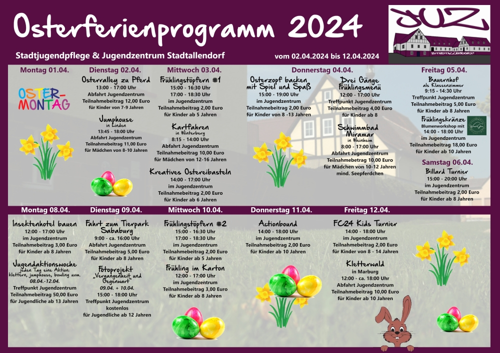 Die Teilnahmegebühr ist spätestens vor Beginn der Ferien (22.03.) im Jugendzentrum zu entrichten.