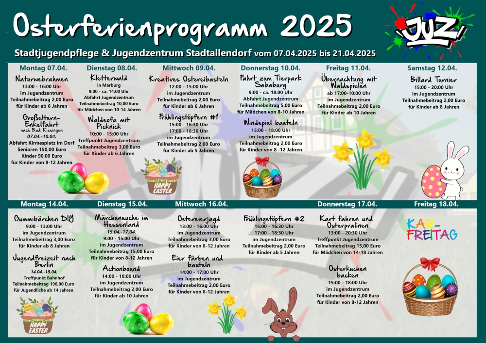 Die Teilnahmegebühr ist spätestens vor Beginn der Ferien (04.04.) im Jugendzentrum zu entrichten.